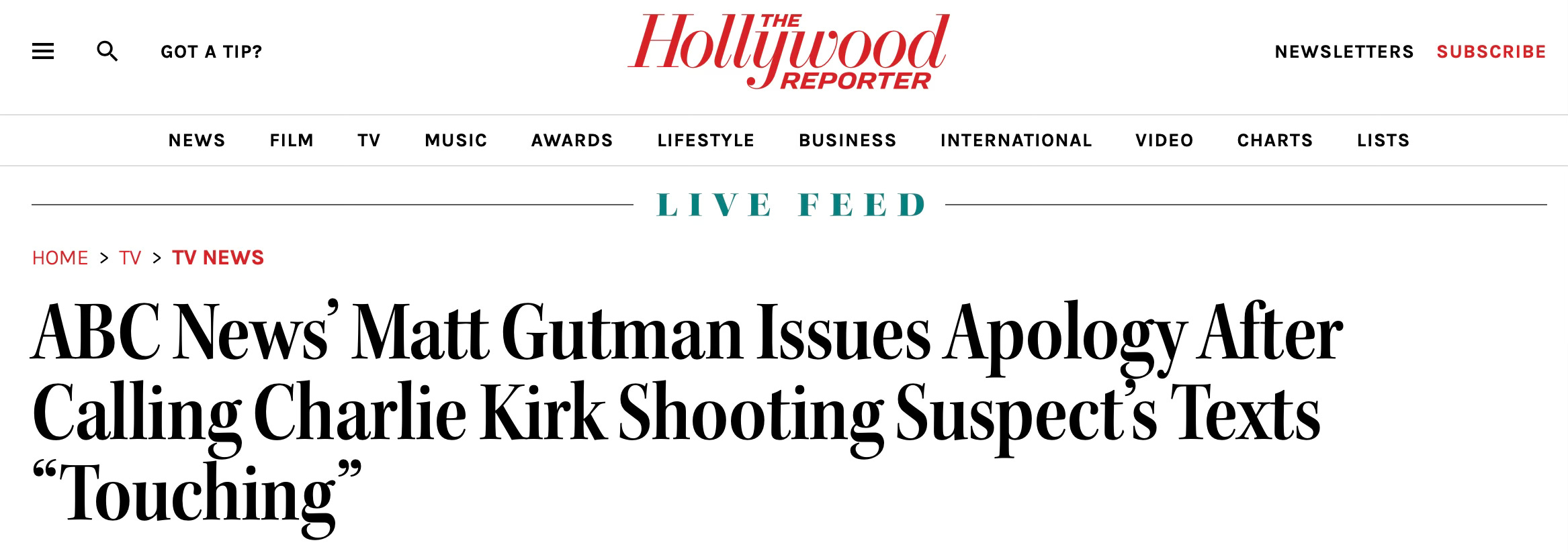 Complicating matters for ABC regarding Jimmy Kimmel’s insensitive remarks was its news division was in the midst of negative public reaction to senior reporter Matt Gutman portraying text messages between the Charlie Kirk assassin and his transgender partner as “touching.”