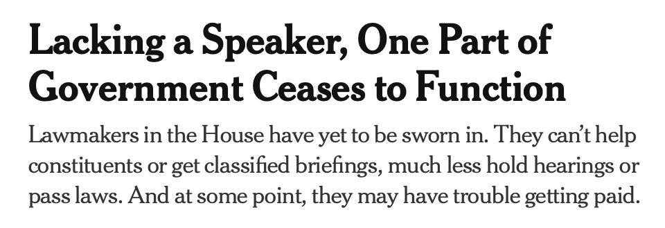 “The lack of a new speaker has ground House business to a halt,” trumpets a CNN headline. The Washington Post warned “The House itself remained in limbo, with no action until a speaker is elected.” Just hours after the very first day of the 118th Congress, the New York Times wailed the legislative branch “ceases to function.”